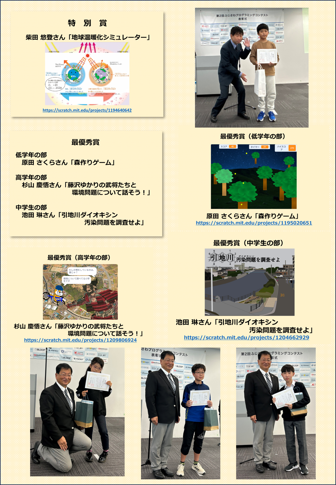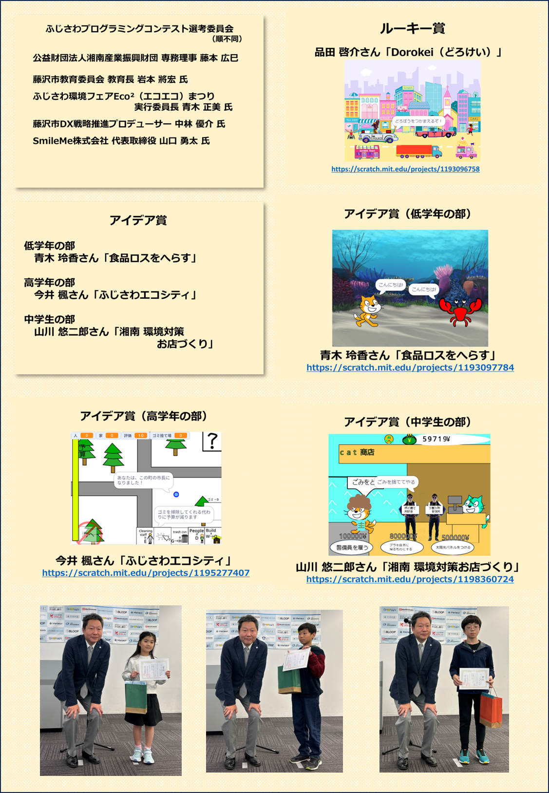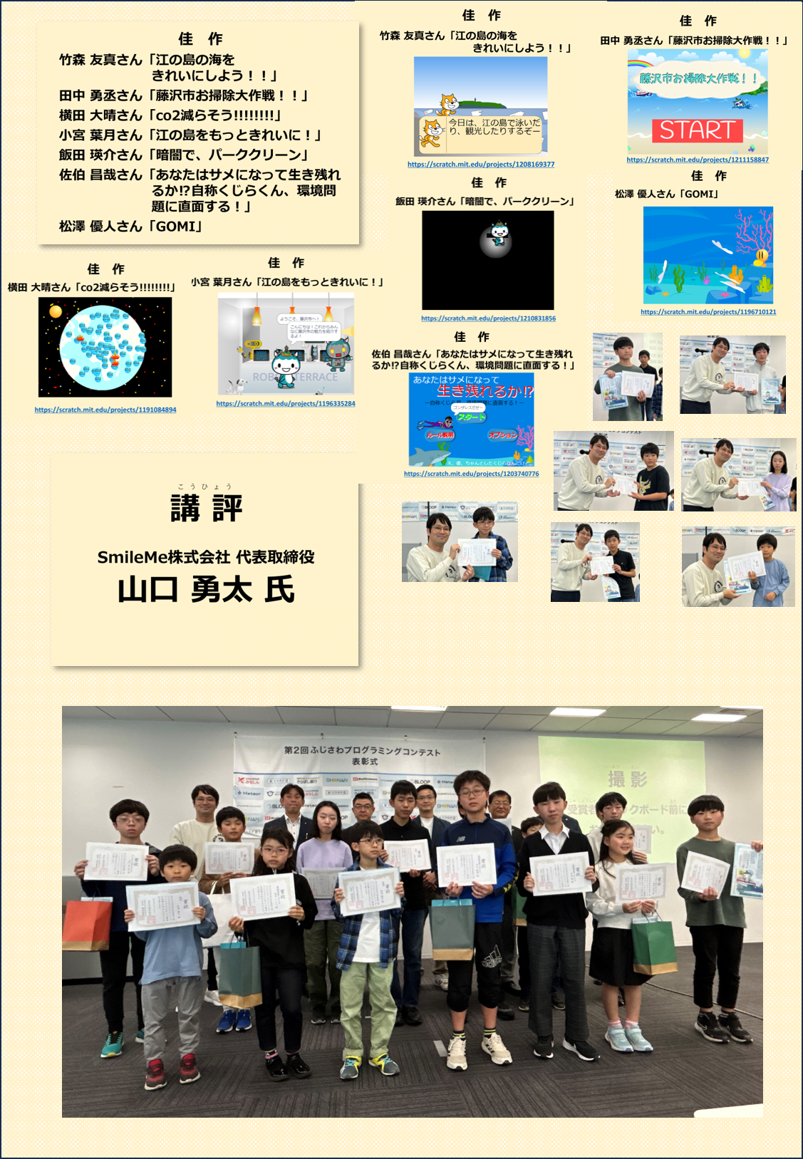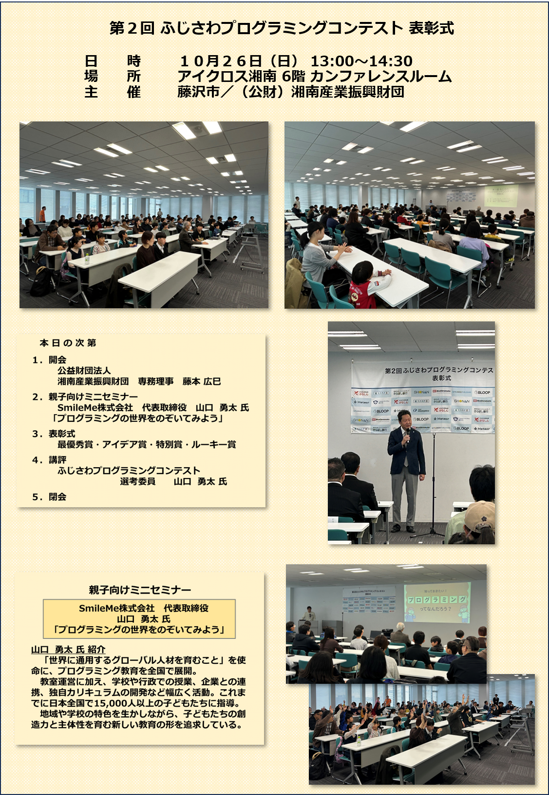 2025年10月26日(日)「第2回ふじさわプログラミングコンテスト表彰式」が開催されました。94の応募作品から、最優秀賞、アイデア賞、特別賞、ルーキー賞の表彰がありました。