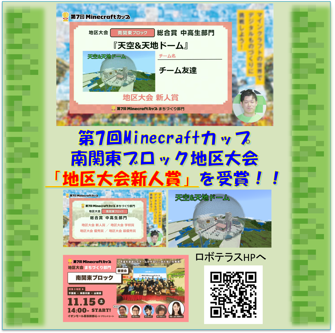 2025年11月15日(土)に千葉県のイオンモールで開催された第7回Minecraftカップ 南関東ブロック地区大会(千葉県・神奈川県・山梨県)において、夏休みに実施した「Minecraftカップ参加者向け短期集中講座」を受講した「チーム友達」(作品名:「天空&天地ドーム」/作品No.6632)が、「地区大会新人賞」を受賞しました。