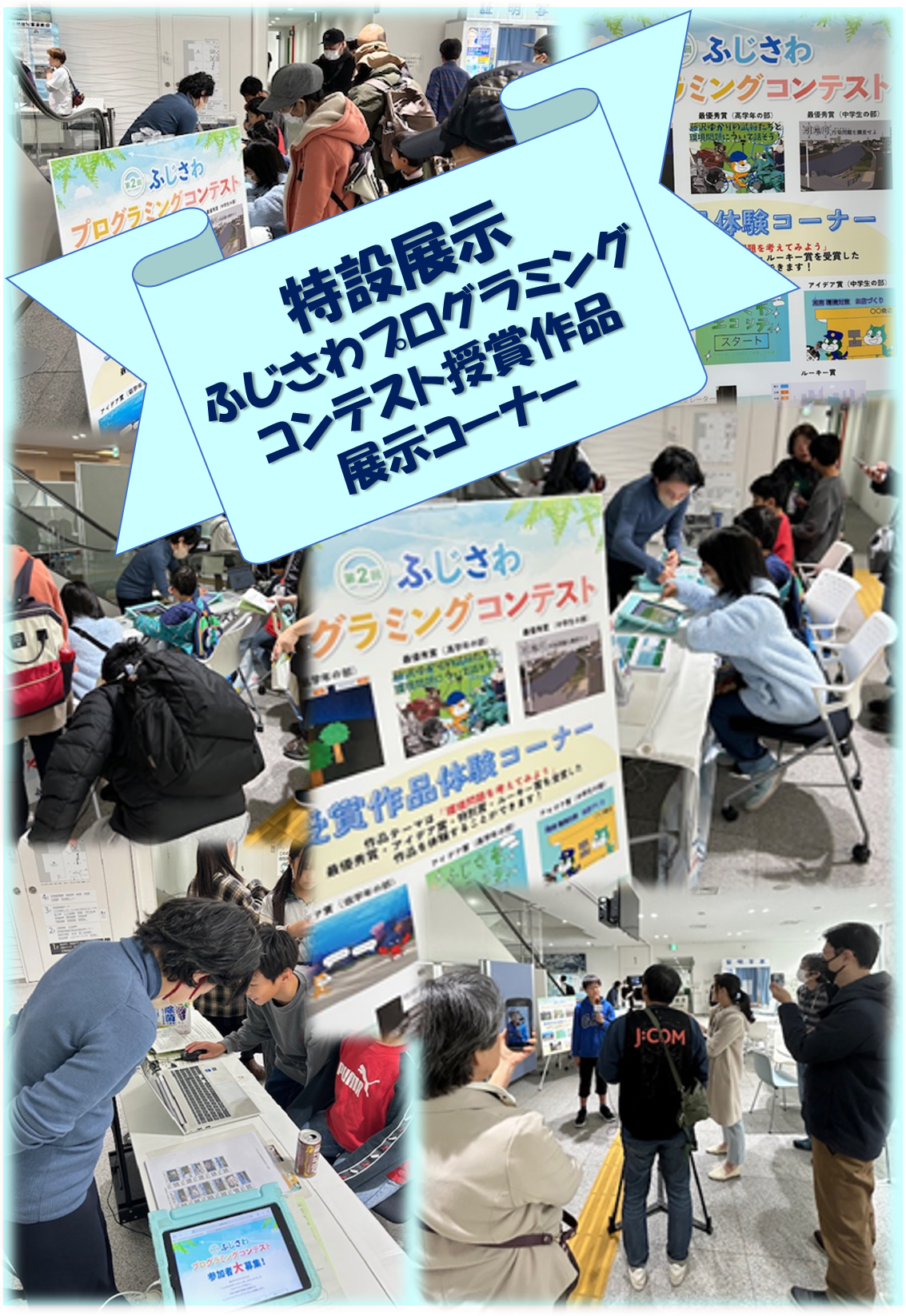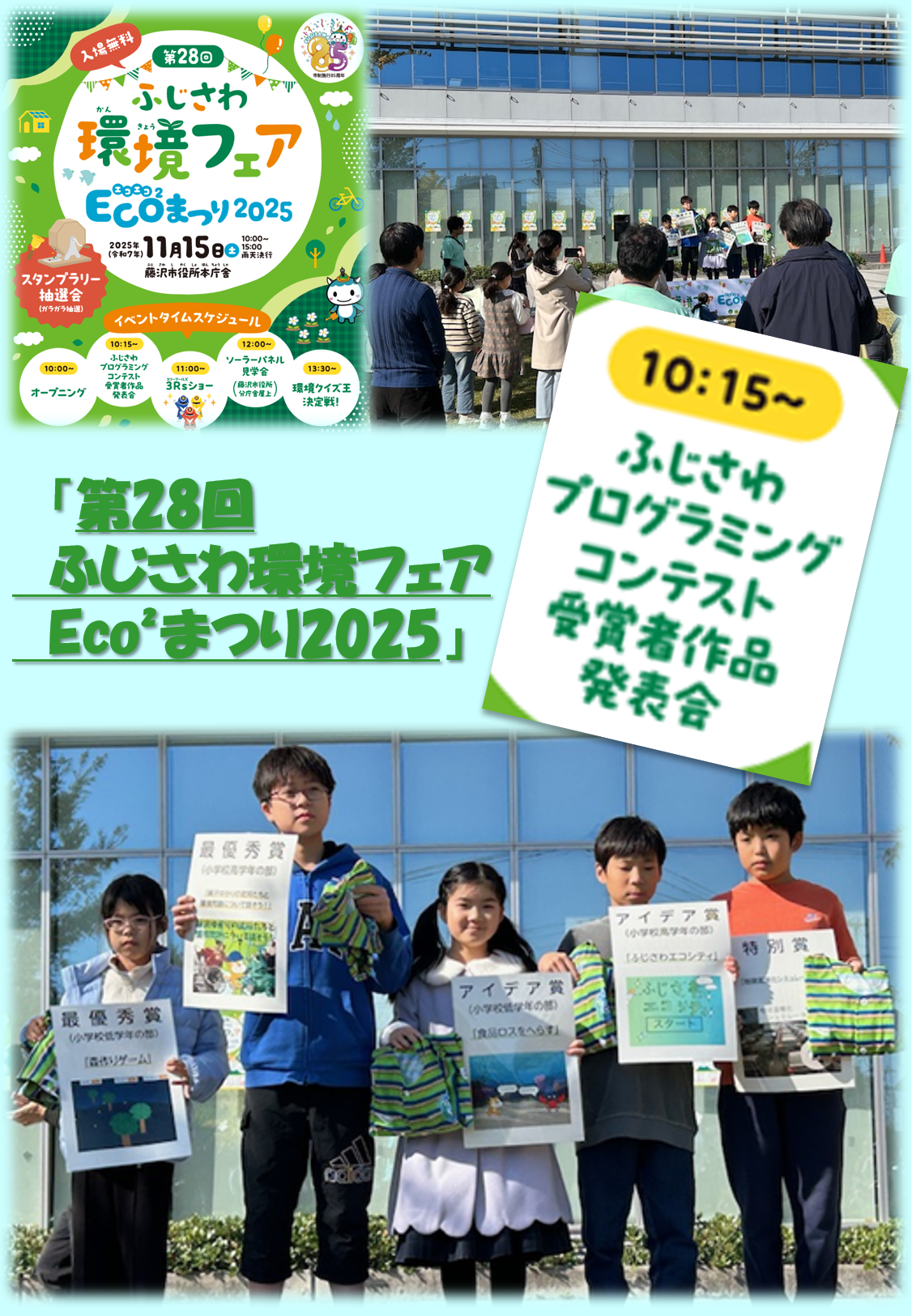 11/15(土)「第2回ふじさわプログラミングコンテスト」受賞作品を、藤沢市役所で開催された「第28回ふじさわ環境フェアEco²(エコエコ)まつり2025」にて発表、展示を行いました。 授賞作品はこちらでご覧いただけます。 https://www.smileme.jp/fujisawa-programming