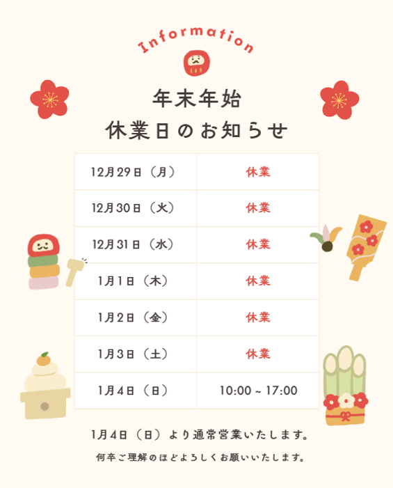 平素よりロボテラスをご利用いただきありがとうございます。 ロボテラスでは、下記の期間休館となりますので、お知らせいたします。 ≪2024年12月29日(月)~2025年1月3日(土)≫ なお、新年は1月4日(日)10:00より通常通り開館いたします。 来年もどうぞロボテラスをよろしくお願いいたします。 みなさま、良いお年をお迎えください。